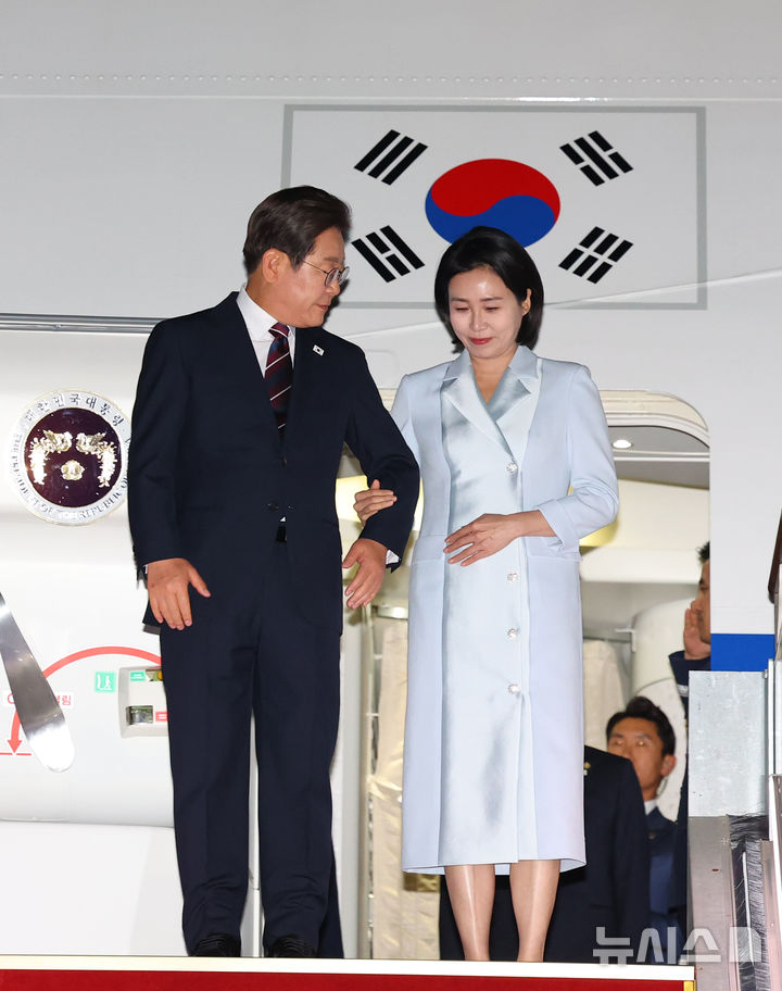 [성남=뉴시스] 최진석 기자 = 이재명 대통령과 부인 김혜경 여사가 19일 주요 7개국(G7) 정상회의 참석을 마치고 성남 서울공항에 도착해 공군 1호기 내리고 있다. 2025.06.19. [email protected]