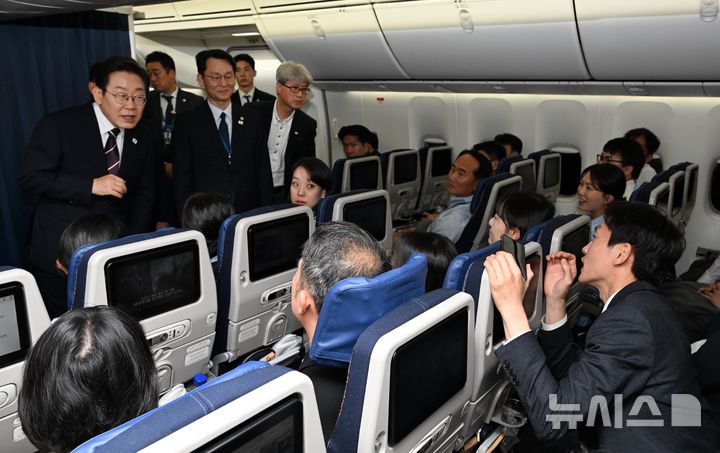[성남=뉴시스] 최진석 기자 = 주요 7개국(G7) 정상회의 참석을 마친 이재명 대통령이 18일 서울공항을 향하는 공군 1호기에서 기자들과 G7 관련 대화를 하고 있다. 2025.06.19. [email protected]