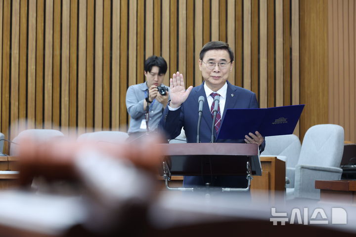 [서울=뉴시스] 고승민 기자 = 이종석 국가정보원장 후보자가 19일 서울 여의도 국회에서 열린 정보위원회의 국가정보원장 후보자 인사청문회에서 선서를 하고 있다. 2025.06.19. [email protected]