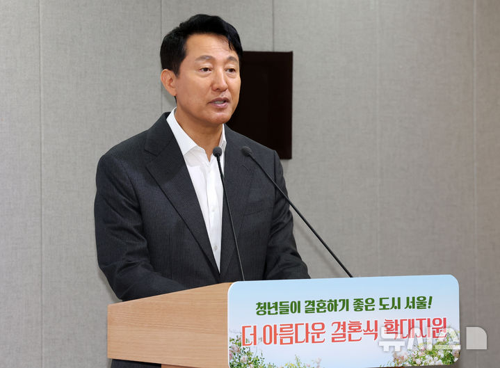 [서울=뉴시스] 배훈식 기자 = 오세훈 서울시장이 19일 오전 서울 중구 시청 브리핑실에서 공공시설을 활용한 더 아름다운 결혼식 확대 지원 계획을 발표하고 있다. 2025.06.19. [email protected]