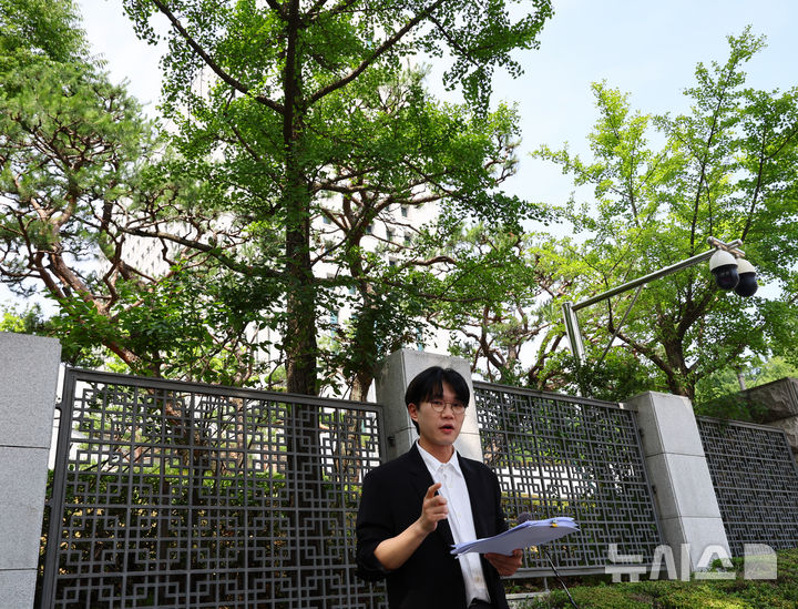 [서울=뉴시스] 박주성 기자 = 백해룡 경정 법률대리인인 이창민 변호사가 19일 서울 서초동 대검찰청 앞에서 마약 수사 외압 사건 검찰 수사 무마 의혹 관련 증거 공개와 설명을 하고 있다. 2025.06.19. [email protected]