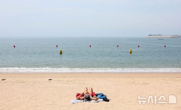 [인천=뉴시스] 전진환 기자 = 전국이 30도 안팎의 무더운 날씨를 보인 19일 인천 중구 왕산해수욕장을 찾은 한 시민이 일광욕을 즐기고 있다.