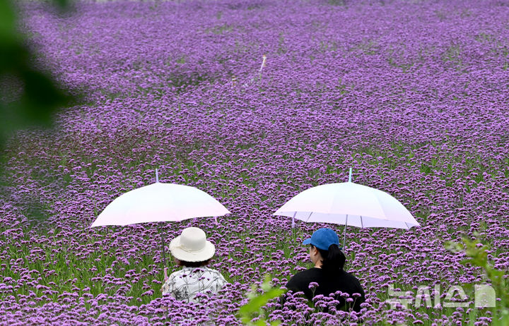 [광주=뉴시스] 김혜인 기자 = 19일 오후 광주 광산구 서봉동 황룡강생태정원에 만개한 버들마편초 사이로 시민들이 나들이를 즐기고 있다. 2025.06.19. [email protected]