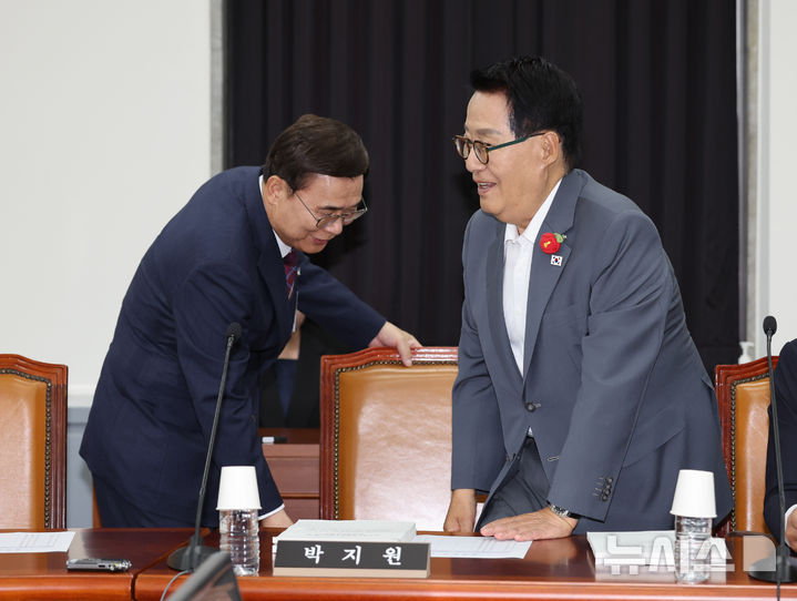 [서울=뉴시스] 김명년 기자 = 이종석 국가정보원장 후보자가 19일 오후 서울 여의도 국회에서 열린 정보위 비공개 인사청문회에서 박지원 더불어민주당 의원의 의자를 빼주고 있다. 2025.06.19. [email protected]
