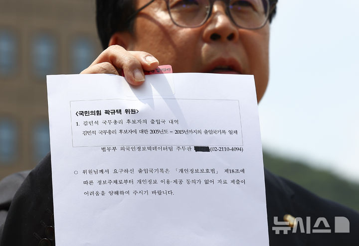 [과천=뉴시스] 김근수 기자 = 곽규택 국민의힘 의원이 19일 경기 정부과천청사 민원실 방문에 앞서 김민석 국무총리 후보자의 출입국 내역 청문회 제출을 촉구하며 취지 발언을 하고 있다. 2025.06.19. [email protected]