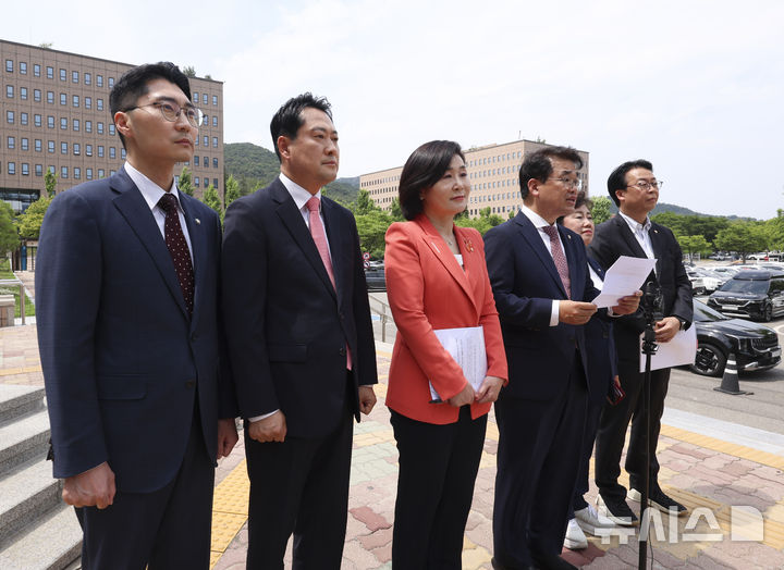 [과천=뉴시스] 김근수 기자 = 배준영(오른쪽 세번째) 국민의힘 의원이 19일 경기 정부과천청사 민원실 방문에 앞서 김민석 국무총리 후보자의 출입국 내역 청문회 제출을 촉구하며 취지 발언을 하고 있다. 2025.06.19. [email protected]