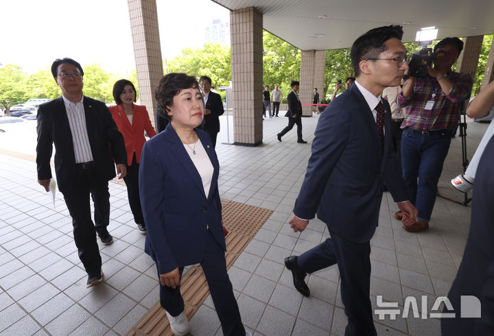 [과천=뉴시스] 김근수 기자 = 조배숙 국민의힘 의원을 비롯한 국민의힘 의원들이 19일 김민석 국무총리 후보자의 출입국 내역 청문회 제출을 촉구하기 위해 경기 정부과천청사 민원실로 들어서고 있다. 2025.06.19. [email protected]