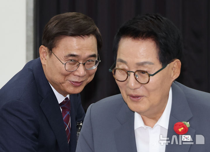 [서울=뉴시스] 김명년 기자 = 이종석 국가정보원장 후보자가 19일 오후 서울 여의도 국회에서 열린 정보위 비공개 인사청문회에서 박지원 더불어민주당 의원의 의자를 빼주며 바라보고 있다 . 2025.06.19. [email protected]
