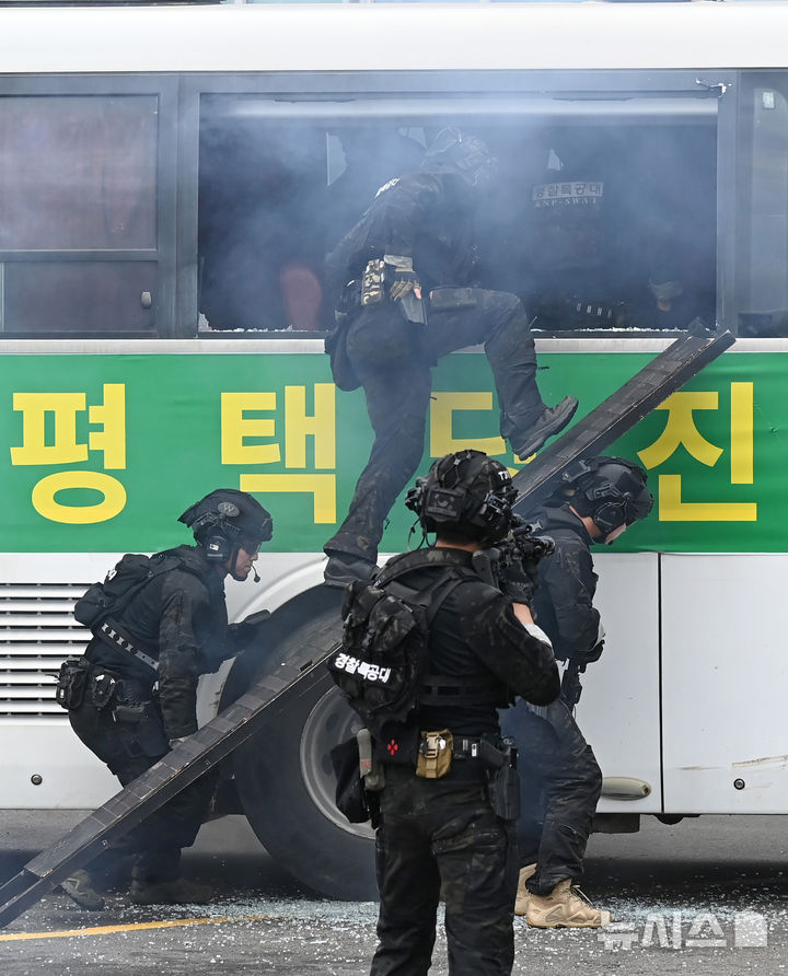 [평택=뉴시스] 김종택 기자 =  '2025 대테러 관계기관 합동훈련'이 실시된 19일 경기 평택시 평택 당진항 국제여객터미널에서 경찰특공대가 인질범을 제압하기 위해 버스안으로 진입하고 있다.