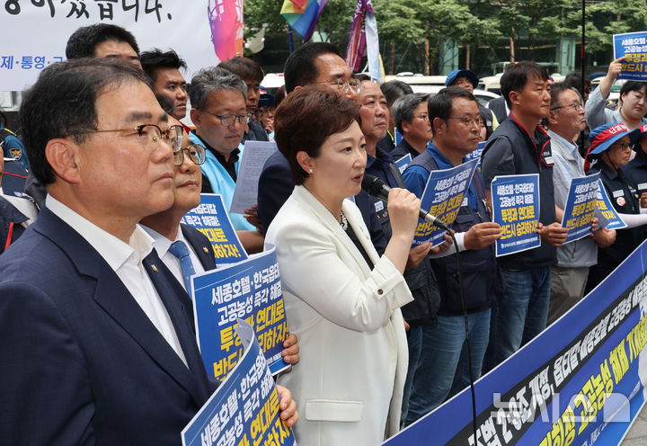 [서울=뉴시스] 배훈식 기자 = 이언주 더불어민주당 의원이 19일 오후 서울 중구 한화빌딩 앞에서 열린 거통고 조선하청지회 김형수 지회장 고공농성 해제 기자회견에서 발언하고 있다. 2025.06.19. [email protected]