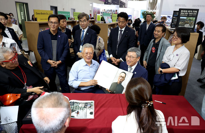 [서울=뉴시스] 김진아 기자 = 문재인 전 대통령이 19일 서울 강남구 코엑스에서 열린 서울국제도서전을 찾아 '한국의 국가 기억 1860년대-1960년대'의 저자 쉬충마오와 대화를 나누고 있다. 2025.06.19. [email protected]