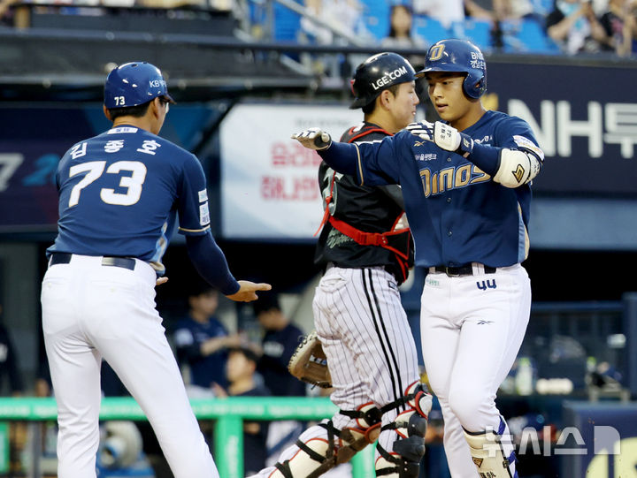 [서울=뉴시스] 김진아 기자 = 19일 오후 서울 송파구 잠실야구장에서 열린 2025 KBO리그 NC 다이노스와 LG 트윈스의 경기, 5회초 2사 NC 김휘집이 솔로 홈런을 친 뒤 홈으로 들어오며 기뻐하고 있다. 2025.06.19. [email protected]