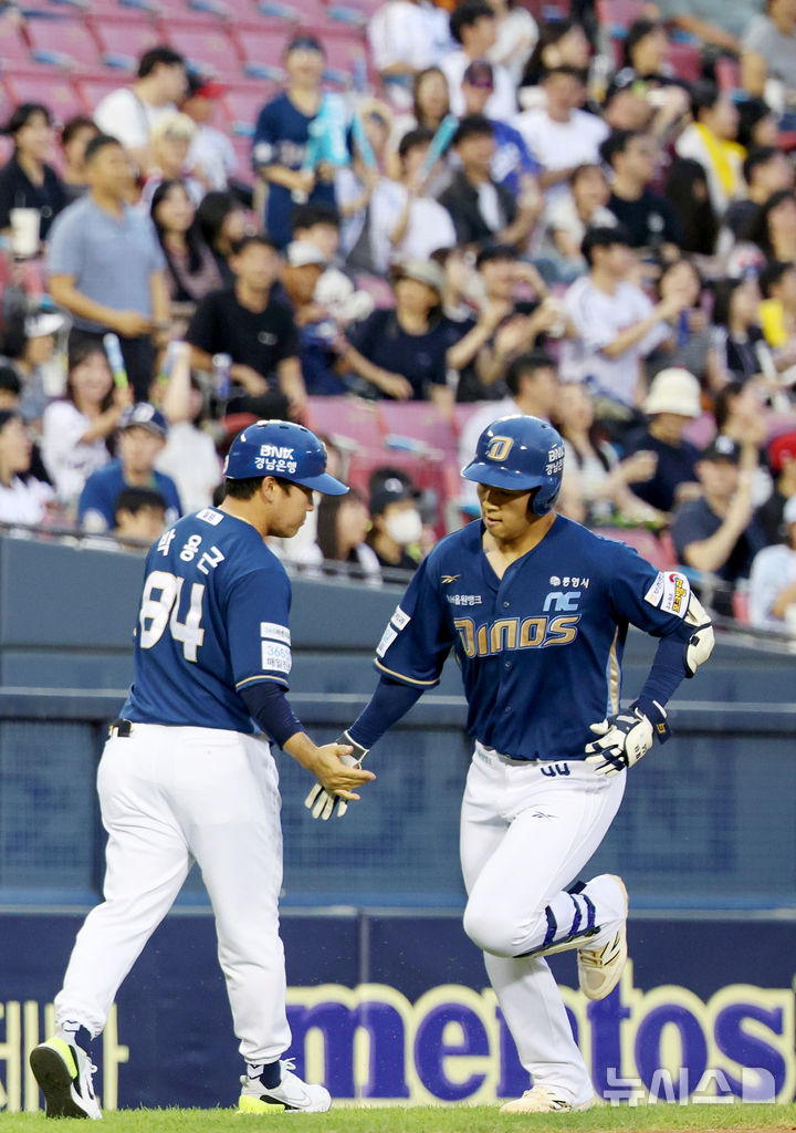 [서울=뉴시스] 김진아 기자 = 19일 오후 서울 송파구 잠실야구장에서 열린 2025 KBO리그 NC 다이노스와 LG 트윈스의 경기, 5회초 2사 NC 김휘집이 솔로 홈런을 친 뒤 기뻐하고 있다. 2025.06.19. [email protected]