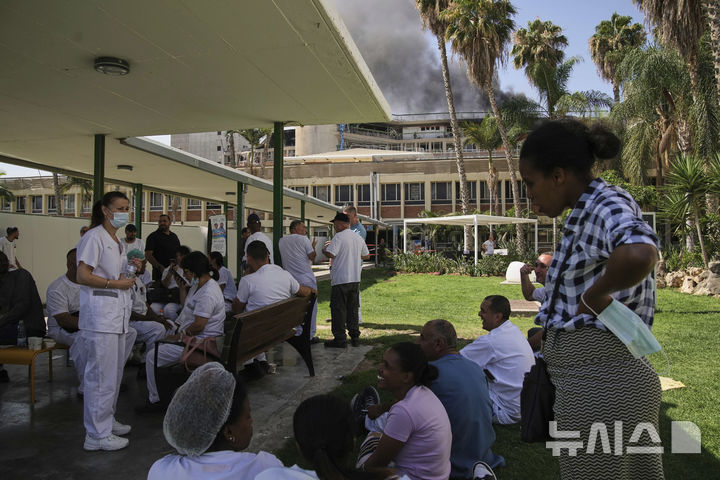 [베르셰바=AP/뉴시스] 19일(현지 시간) 이스라엘 베르셰바에 있는 소로카 병원 단지 내 건물이 이란의 미사일 공격을 받아 연기가 피어오르는 가운데 병원 밖에 의료진이 모여 있다. 이란 혁명수비대는 “병원 근처 이스라엘군 지휘·정보센터가 타격받았다”라고 주장했다. 2025.06.20.