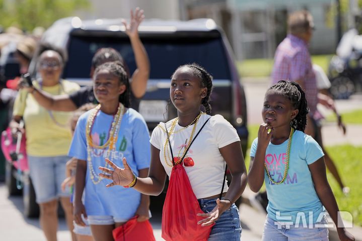 [갤버스턴=AP/뉴시스] 19일(현지 시간) 미 텍사스주 갤버스턴에서 '준틴스' 퍼레이드를 지켜보는 소녀들이 행렬에서 던져주는 사탕을 기다리고 있다. '준틴스'는 1865년 6월 19일 텍사스주를 끝으로 흑인 노예제가 폐지된 것을 기념하는 연방 공휴일이다. 2025.06.20.