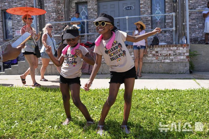 [갤버스턴=AP/뉴시스] 19일(현지 시간) 미 텍사스주 갤버스턴에서 두 흑인 소녀가 '준틴스' 퍼레이드를 지켜보며 춤추고 있다. '준틴스'는 1865년 6월 19일 텍사스주를 끝으로 흑인 노예제가 폐지된 것을 기념하는 연방 공휴일이다. 2025.06.20.