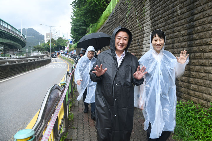 [의정부=뉴시스] 20일 오후 경기 의정부시 경민대학교와 반환 미군기지 캠프 레드클라우드(CRC) 일대에서 열린 '2025 의정부 워킹 페스타! 보go! 걷go! 뛰go!' 행사에 참여한 김동근 의정부시장과 홍지연 경민대 총장이 함께 걷고 있다. (사진=의정부시 제공) 2025.06.20 [email protected]