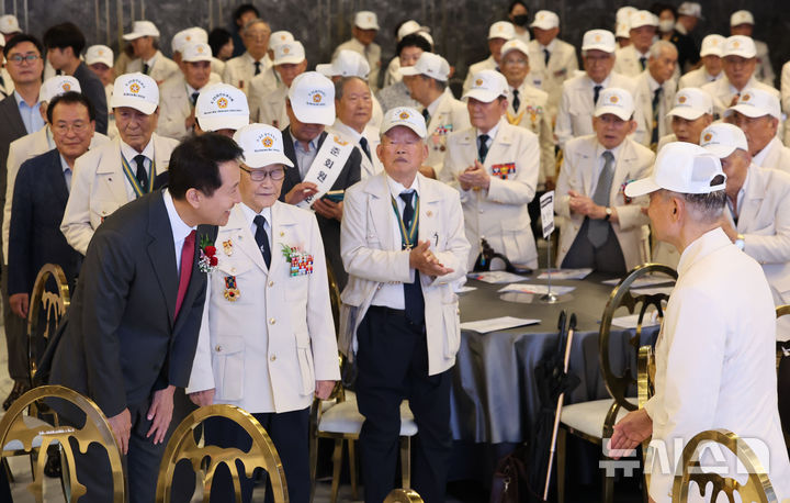 [서울=뉴시스] 권창회 기자 = 오세훈 서울시장이 20일 오전 서울 마포구 제75주년 6.25전쟁 참전유공자 위로연 및 준회원 호국봉사단 발대식에서 6.25 참전용사들에게 인사하고 있다. 2025.06.20. [email protected]