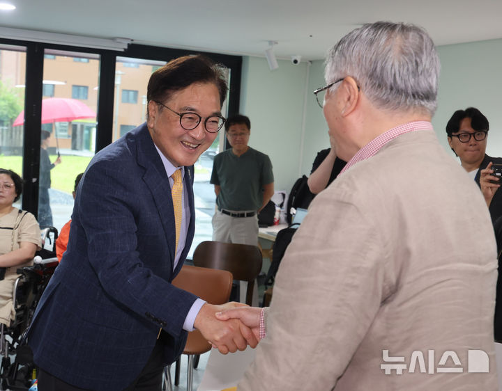 [인천=뉴시스] 전진환 기자 = 우원식 국회의장이 20일 오전 경기도 김포시의 장애-비장애 소셜믹스 특화형 임대주택 '여기가'의 준공 기념 간담회에 참석해 김용익 재단법인 '돌봄과 미래' 이사장과 인사하고 있다. 2025.06.20. [email protected]