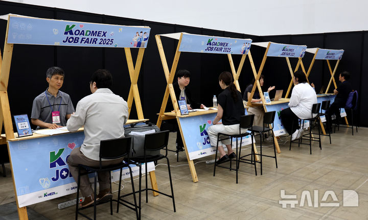 [대구=뉴시스] 이무열 기자 = 20일 대구 북구 엑스코에서 열린 대한민국 국제 첨단의료기기 및 의료 산업전 취업박람회에서 구직자들이 현장면접을 보고 있다. 2025.06.20. [email protected]