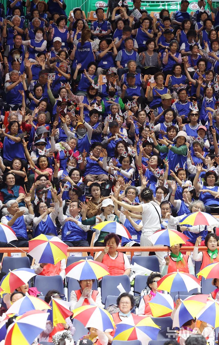 [부산=뉴시스] 하경민 기자 = '제45회 부산시장기 노인생활체육대회'가 열린 20일 부산 동래구 사직실내체육관에서 노인들이 열띤 응원전을 펼치고 있다.