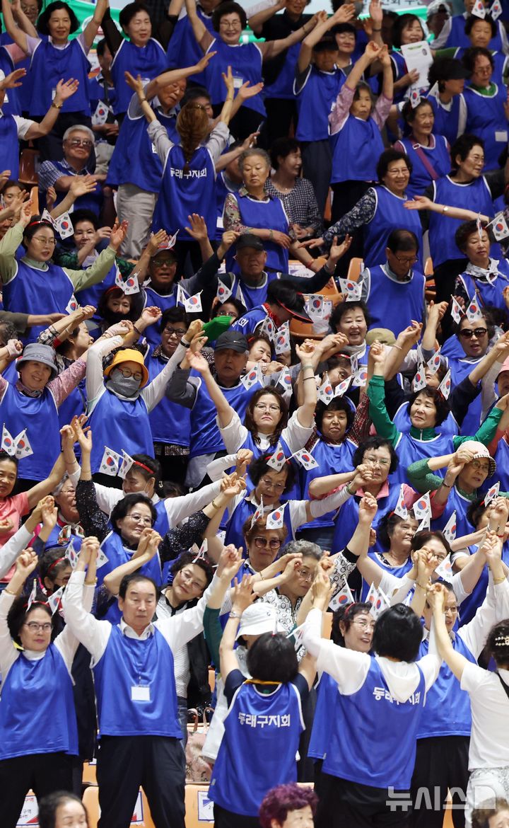 [부산=뉴시스] 하경민 기자 = '제45회 부산시장기 노인생활체육대회'가 열린 20일 부산 동래구 사직실내체육관에서 노인들이 열띤 응원전을 펼치고 있다.
