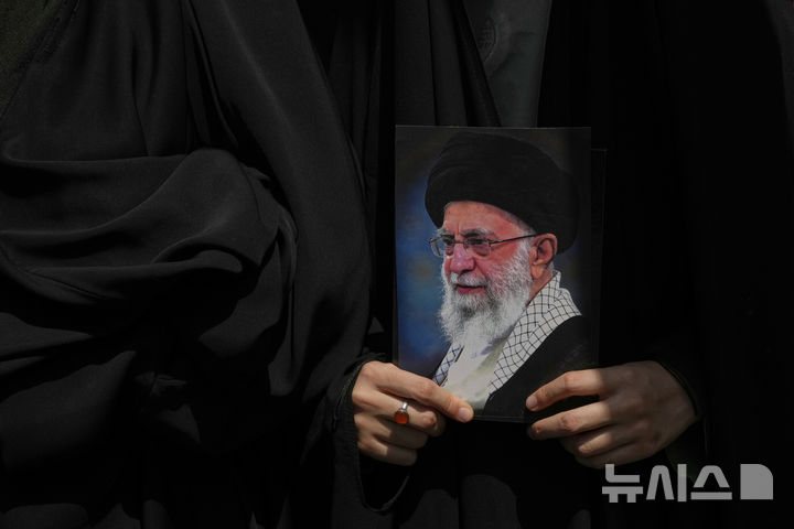 [테헤란=AP/뉴시스] 20일(현지 시간) 이란 테헤란에서 금요 예배 후 열린 이스라엘의 공습 규탄 시위 참가자가 아야톨라 알리 하메네이 최고지도자의 사진을 들고 있다. 2025.06.21.