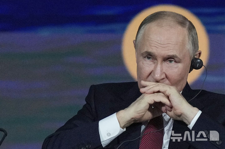 [상트페테르부르크(러시아)=AP/뉴시스]블라디미르 푸틴 러시아 대통령이 20일(현지시각) 상트페테르부르크 국제경제포럼에 참석하고 있다. 블라디미르 푸틴 러시아 대통령은 20일(현지시각) 러시아는 무기 공동 생산과 군인 합동훈련에 참여를 원하는 '우호국가'들과 군사 및 기술 협력을 발전시킬 계획이라고 밝혔다고 알 아라비야 방송이 보도했다. 2025.06.21.