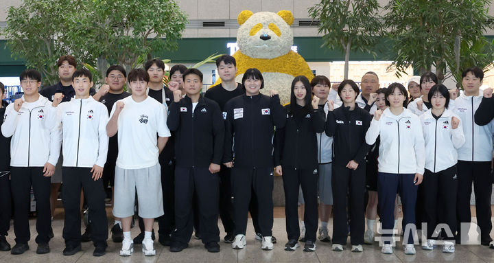 [인천공항=뉴시스] 김선웅 기자 = 헝가리에서 열린 2025 세계유도선수권대회에 출전해 혼성 단체전에서 은메달을 획득한 유도 대표팀 선수들이 22일 인천국제공항을 통해 귀국해 단체 기념사진을 촬영하고 있다.