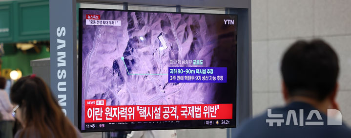 [인천공항=뉴시스] 김선웅 기자 = 22일 인천국제공항 입국장에 설치된 TV 화면에서 미국의 이란 핵시설 공습 관련 뉴스가 방송되고 있다. 2025.06.22. [email protected]