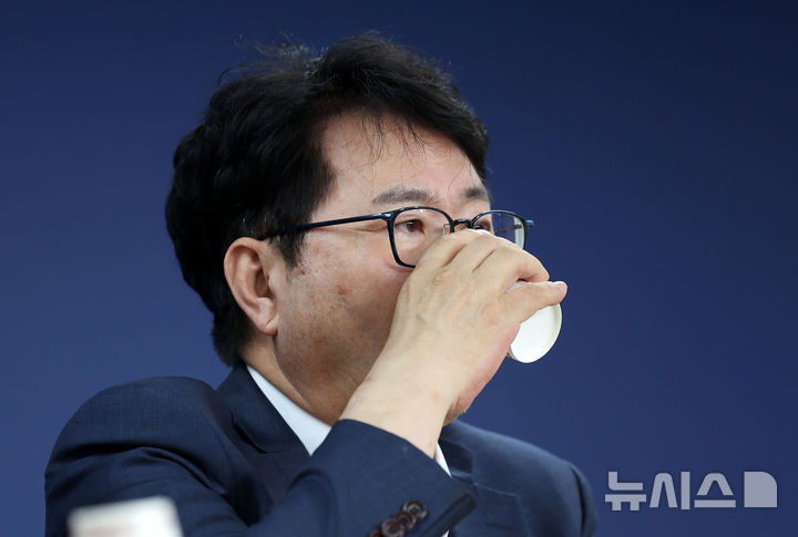 [서울=뉴시스] 홍효식 기자 = 이한주 국정기획위원회 위원장이 22일 오후 서울 종로구 정부서울청사 창성동 별관 브리핑실에서 열린 기자간담회에서 물을 마시고 있다. 2025.06.22. [email protected]