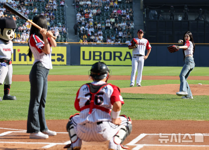 [서울=뉴시스] 배훈식 기자 = 22일 오후 서울 송파구 잠실야구장에서 열린 2025 신한 쏠뱅크 KBO리그 LG 트윈스와 두산 베어스의 경기, 트리플에스 유연과 채연이 시구, 시타를 하고 있다. 2025.06.22. [email protected]