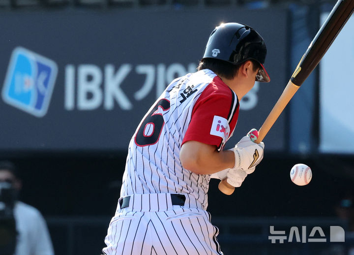 [서울=뉴시스] 배훈식 기자 = 22일 오후 서울 송파구 잠실야구장에서 열린 2025 신한 쏠뱅크 KBO리그 LG 트윈스와 두산 베어스의 경기, 1회말 1사 만루 상황에서 LG 구본혁이 공에 맞고 있다. 2025.06.22. [email protected]