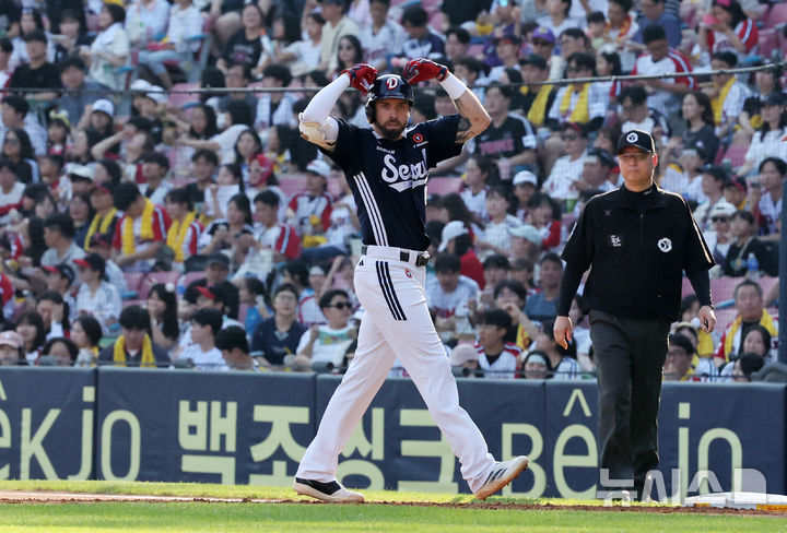 [서울=뉴시스] 배훈식 기자 = 22일 오후 서울 송파구 잠실야구장에서 열린 2025 신한 쏠뱅크 KBO리그 LG 트윈스와 두산 베어스의 경기, 2회초 1사 상황에서 안타를 친 두산 케이브가 덕아웃을 향해 세리머니를 하고 있다. 2025.06.22. [email protected]