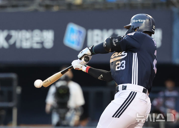 [서울=뉴시스] 배훈식 기자 = 22일 오후 서울 송파구 잠실야구장에서 열린 2025 신한 쏠뱅크 KBO리그 LG 트윈스와 두산 베어스의 경기, 8회초 무사 만루에서 두산 강승호가 1타점 적시타를 터뜨리고 있다. 2025.06.22. [email protected]