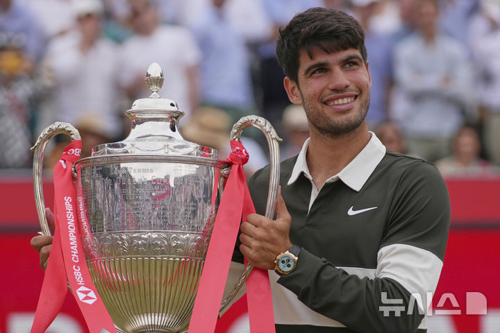 [런던=AP/뉴시스] 카를로스 알카라스(2위·스페인)가 22일(현지 시간) 영국 런던 퀸스 클럽 앤디 머리 아레나에서 열린 2025 남자프로테니스(ATP) 투어 HSBC 챔피언십(ATP 500) 정상에 올라 트로피를 들고 포즈를 취하고 있다. 알카라스는 결승에서 이르지 레헤츠카(30위·체코)를 2-1(7-5 6-7 6-2)로 꺾고 우승을 차지했다. 2025.06.23.