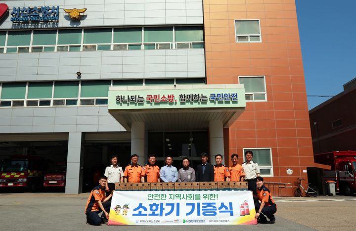 [서산=뉴시스] 김덕진 기자=한화토탈에너지스, HD현대오일뱅크, ㈜에이스에프에스 관계자가 23일 서산소방서를 방문해 안전한 지역사회를 위한 소화기 350여개를 기탁한 후 기념 사진을 찍고 있다. (사진=서산소방서 제공) 2025.06.23. [email protected]
