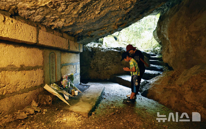 [이토만=AP/뉴시스] 23일 오키나와 전투 종전 80주년을 맞아 일본 오키나와현 이토만의 한 동굴을 찾은 방문객들이 제2차 세계대전 태평양 전쟁 당시 숨진 희생자들을 위해 기도하고 있다. '오키나와 전투'는 1945년 4월 1일부터 6월 23일까지 벌어진 전투로 약 12만 명의 오키나와 주민이 희생된 것으로 알려졌다. 2025.06.23.