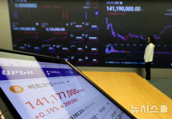 [서울=뉴시스] 이영환 기자 = 23일 오전 서울 강남구 업비트 고객센터 전광판에 비트코인 거래 가격이 표시되고 있다.