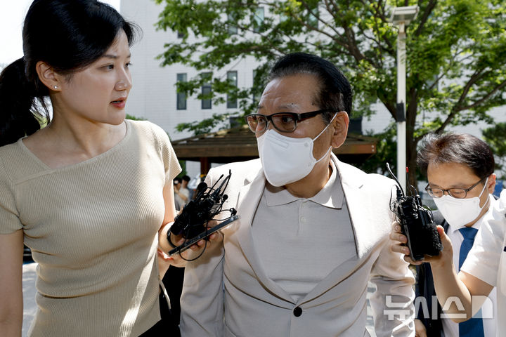 [서울=뉴시스] 배훈식 기자 = 건진법사로 불리는 전성배씨가 23일 오전 서울 양천구 서울남부지방법원에서 열린 정치자금법 위반 혐의 3차 공판에 출석하며 취재진의 질문을 받고 있다. (공동취재) 2025.06.23. [email protected]