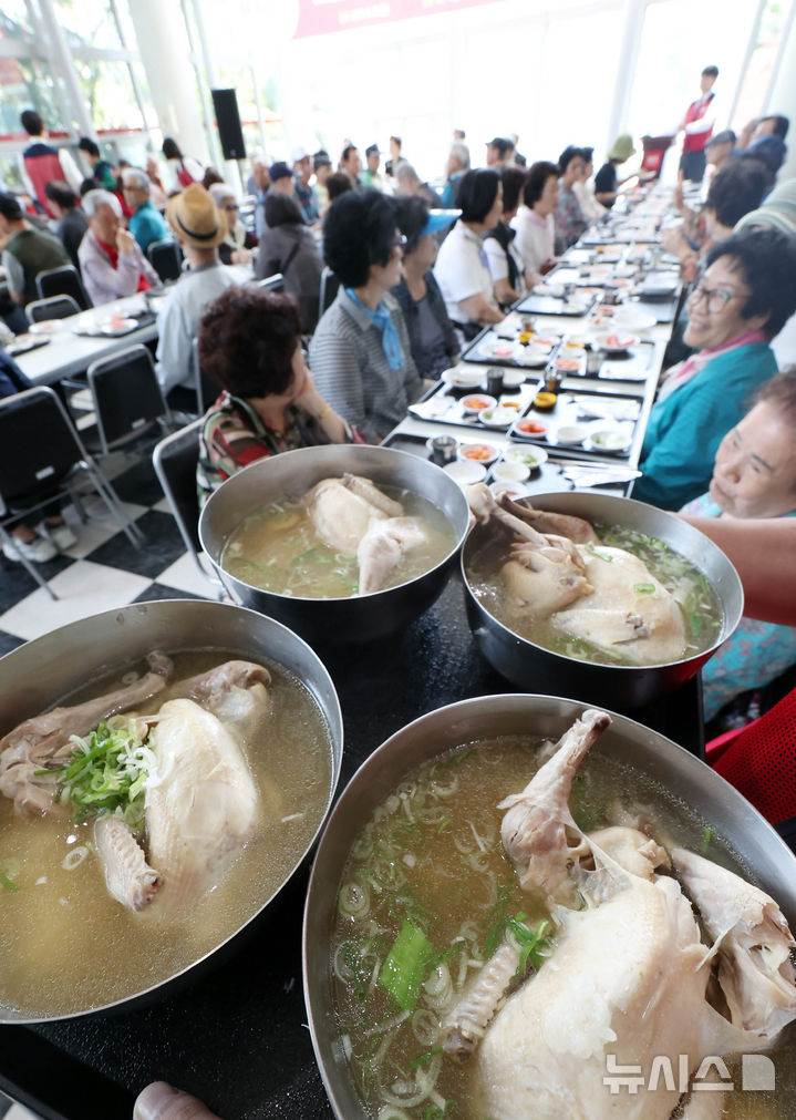 [부산=뉴시스] 하경민 기자 = 경남정보대학교 총학생회 소속 학생과 교직원 등이 23일 부산 사상구 대학 내 학생식당에서 6·25전쟁 발발 제75주년을 앞두고  보훈가족 250여 명을 초청해 여름철 대표 보양식인 삼계탕을 대접하고 있다. 2025.06.23. [email protected]