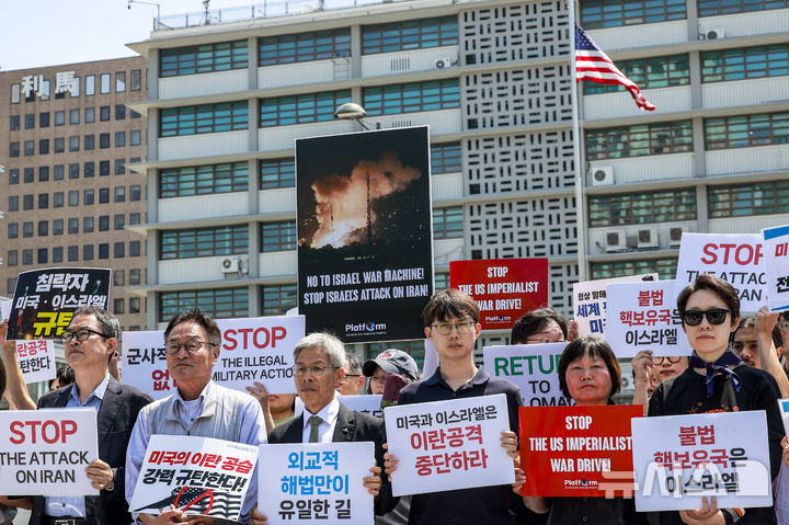 [서울=뉴시스] 정병혁 기자 = 23일 서울 종로구 주한미국대사관 앞에서 열린 미국의 이란공격 규탄 기자회견에서 시민사회단체 회원들이 피켓을 들고 있다. 2025.06.23. [email protected]