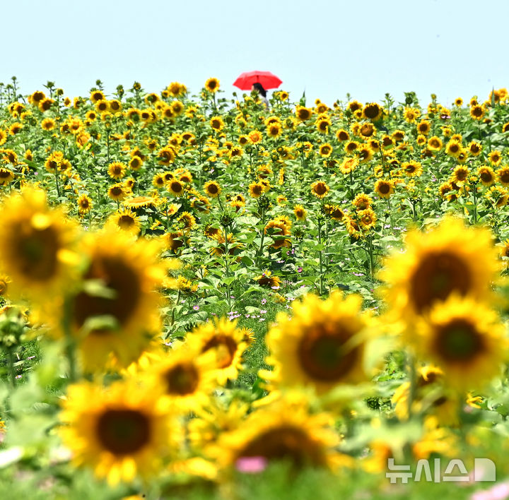 [안성=뉴시스] 김종택 기자 = 장마가 소강상태를 보인 23일 경기 안성시 안성팜랜드를 찾은 한 시민이 활짝 핀 해바라기를 바라보며 산책하고 있다. 2025.06.23. [email protected]