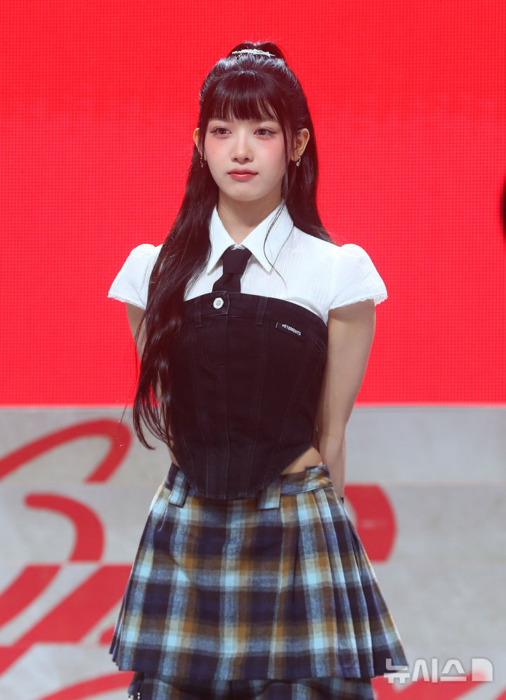 [서울=뉴시스] 김혜진 기자 = 그룹 베이비돈크라이 쿠미가 23일 오후 서울 용산구 블루스퀘어에서 열린 첫 번째 데뷔 싱글 앨범 '에프 걸(F Girl)' 발매 기념 쇼케이스에서 포즈를 취하고 있다. 2025.06.23. [email protected]