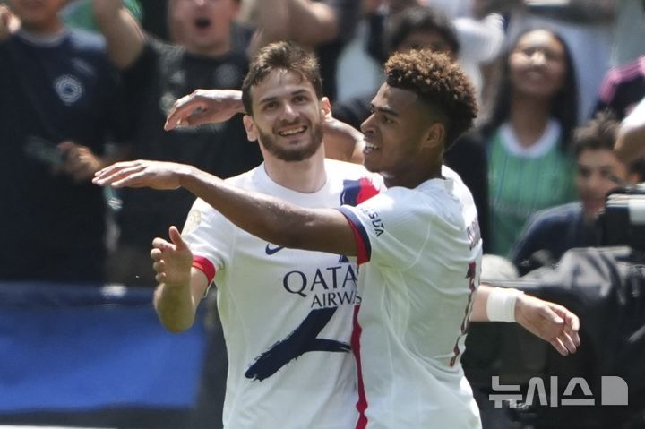 [시애틀=AP/뉴시스] 파리 생제르맹(PSG, 프랑스)의 흐비차 크바라츠헬리아(왼쪽)가 23일(현지 시간) 미 워싱턴주 시애틀 루멘 필드에서 열린 2025 국제축구연맹(FIFA) 클럽 월드컵 조별리그 B조 3차전 시애틀 사운더스(미국)와의 경기 전반 35분 선제골을 넣은 후 환호하고 있다. 이강인이 벤치를 지킨 PSG가 2-0으로 승리하고 2승1패를 기록하며 조 1위로 16강에 올랐다. 2025.06.24.