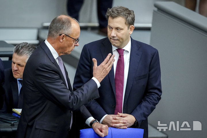 [베를린=AP/뉴시스]프리드리히 메르츠 독일 총리(왼쪽)와 라르스 클링바일 독일 부총리 겸 재무장관이 24일 베를린 연방 하원 회의에 참가하고 있다. 클링바일 장관은 이날 새 정부의 지출 계획을 발표하면서 국방비를 2029년 국내총생산(GDP)의 3.5%로 끌어올리겠다고 다짐했다. 2025.06..24.
