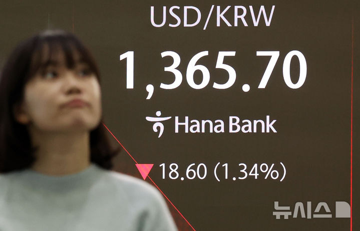 [서울=뉴시스] 홍효식 기자 = 서울 외환시장에서 원·달러 환율이 전 거래일 주간거래 종가(1384.3원)보다 15.3원 내린 1369원에 출발한 24일 오전 서울 중구 하나은행 딜링룸 전광판에 지수가 표시되고 있다.