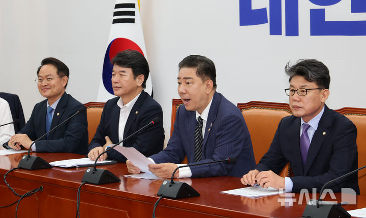 [서울=뉴시스] 김금보 기자 = 김병기 더불어민주당 당대표 직무대행 겸 원내대표가 24일 오전 서울 여의도 국회에서 열린 원내대책회의에서 발언하고 있다. 2025.06.24. [email protected]
