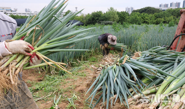[인천=뉴시스] 전진환 기자 = 24일 오전 인천 남동구의 한 대파농장에서 작업자들이 장마철 집중호우에 대비해 폭염 속 대파를 수확하고 있다. 2025.06.24.  [email protected]