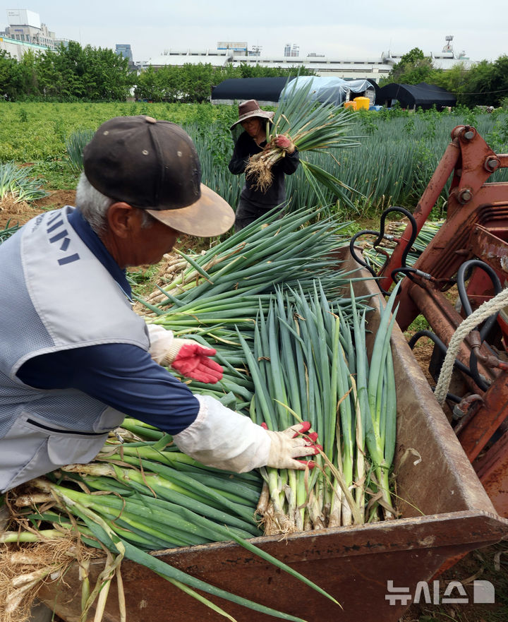 [인천=뉴시스] 전진환 기자 = 24일 오전 인천 남동구의 한 대파농장에서 작업자들이 장마철 집중호우에 대비해 폭염 속 대파를 수확하고 있다. 2025.06.24.  [email protected]